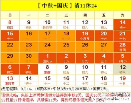 中秋國慶連休24天請假攻略走紅